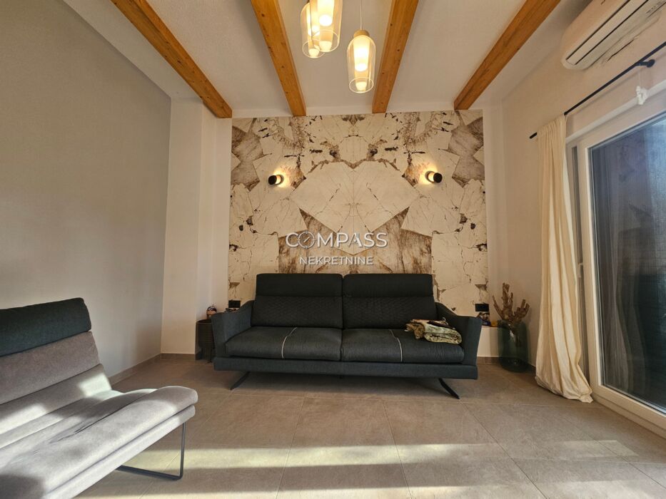 Před domem je upravená zahrada s malým potůčkem, zatímco na západní straně se nachází prostornější dvůr s možností vytvoření venkovní kuchyně, vířivky, letní či zimní zahrady a podobných zařízení. Nemovitost se nachází v klidné lokalitě, obklopena zelení, chráněna před hlukem a pohledy z ulice, a přitom blízko pláže a moře. Pozemek je zcela oplocen a upraven středomořskou vegetací. Dokumentace je v pořádku, vlastnictví zapsáno bez zátěže a dům má stavební povolení.