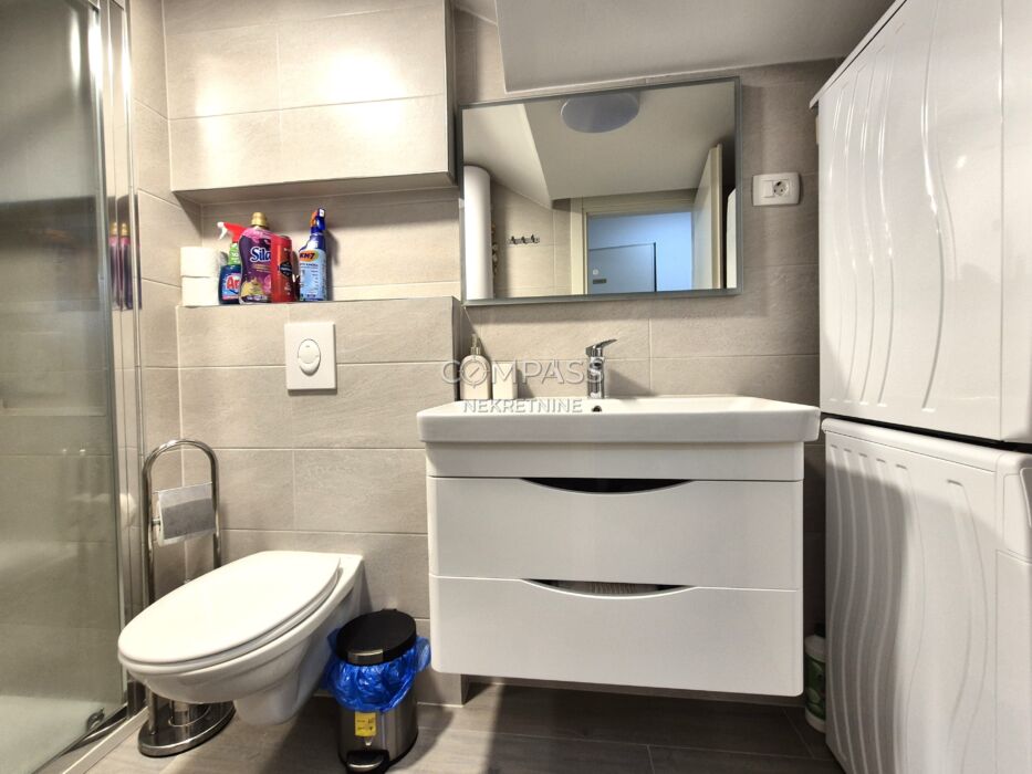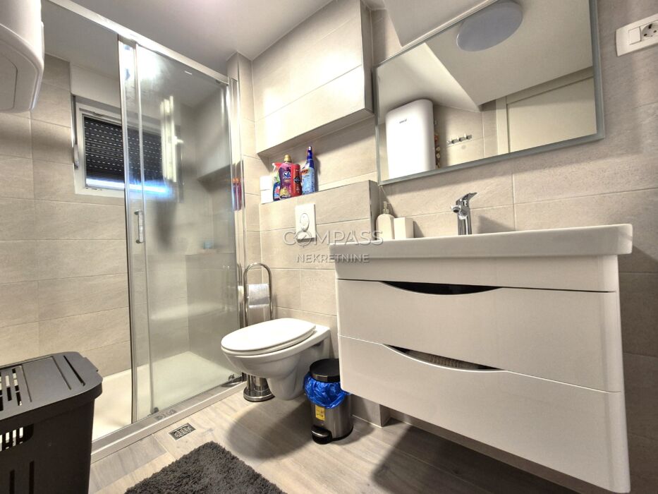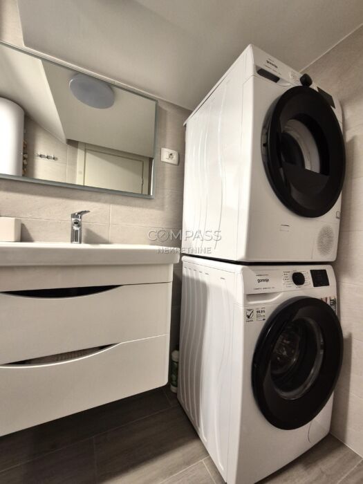 Je plně zařízený a vybavený – včetně pračky, sušičky, myčky nádobí, podlahového vytápění a klimatizace.