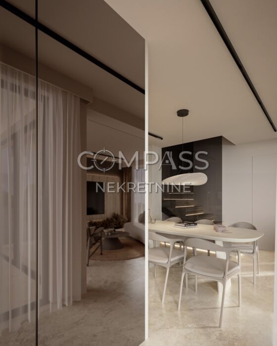 Prostrana kuhinja i blagovaonica s dodatnim WC-om, povezana s velikim dnevnim boravkom koji izlazi na dvije vanjske terase na suprotnim stranama. Na južnoj strani nalazi se privatni bazen s kompletnom pripremom za grijanje, sunčalište, prostor za roštilj i popločeni vrt uređen mediteranskim biljkama.